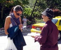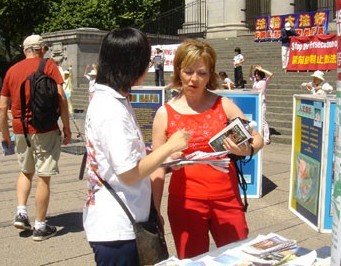 来自埃德蒙顿的女士Rhonda在现场流连了近一个小时,她认真与多位学员交谈,了解什么是法轮功和为什么被迫害,后来又在现场要求学员教她五套功法。