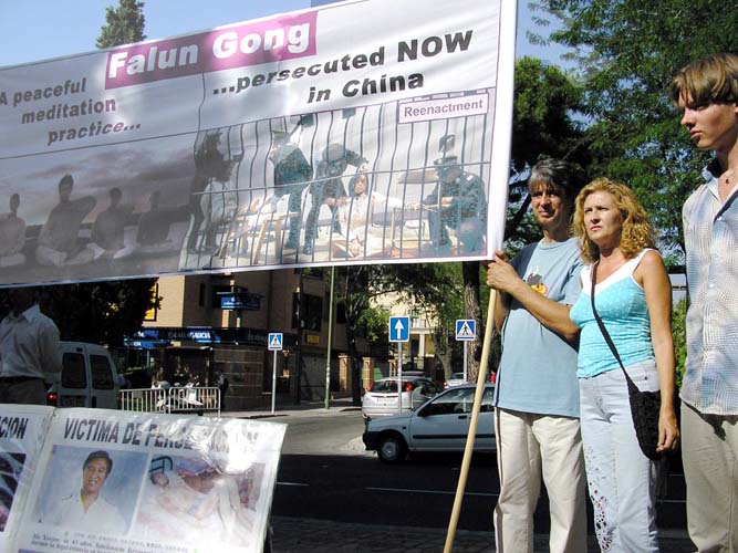 西班牙法轮功学员和律师在中共驻马德里大使馆前和平请愿,要求制止在中国正在发生的“人类历史上最大的群体灭绝”和“对几十万拥有信仰自由的无辜的人进行迫害和酷刑。”