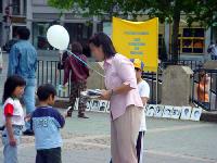 ![]() 平静安详的演示法轮功功法 | ![]() 给我一张真象传单 | ![]() 渴望拥有洪法书签的孩子们 |