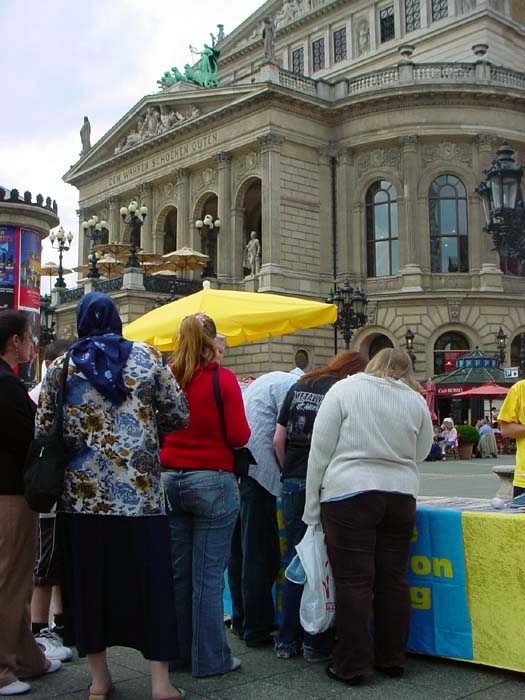 2005年7月23日,星期六,在德国国际金融中心法兰克福市老歌剧院前,由法轮功学员举办的“7•20”六周年,呼吁制止迫害的活动中,记者找到了答案。