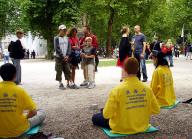 由于本年度是150周年的大庆,全国各地的游客都赶到布鲁塞尔参观游行。特别是市中心公园,各式各样的主题活动,以及比邻游行路线的地理优势,吸引了最多的人群。在人潮涌动的公园中心的空地上,法轮功学员分成两部份,一部份炼功,另一部份向过往游人散发传单。