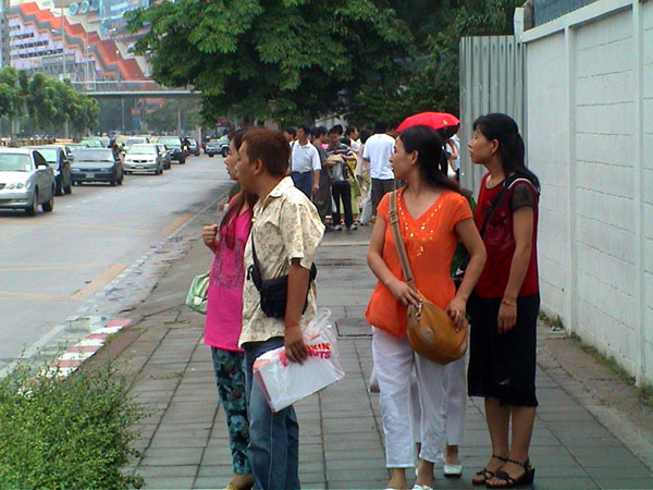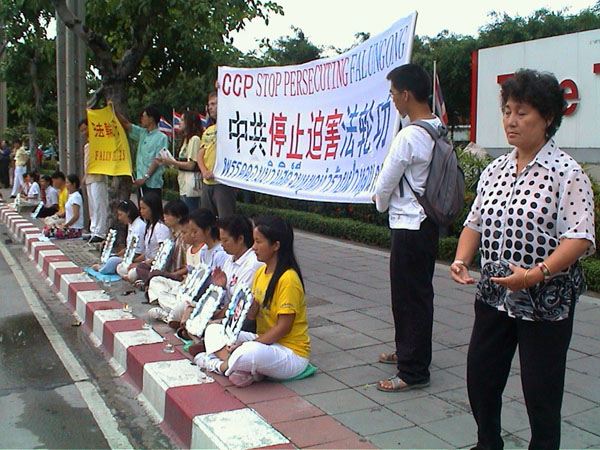 学员们还于7月23日在中共驻曼谷大使馆外,呼吁制止发生在中国的迫害。一些来自中国的游客停下脚步在观看着。
