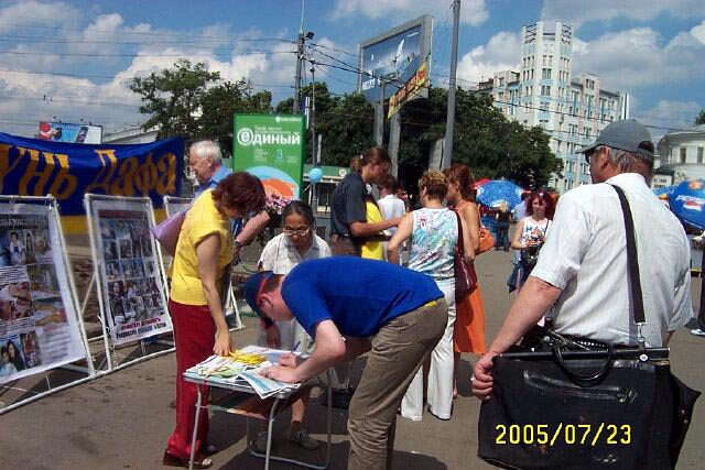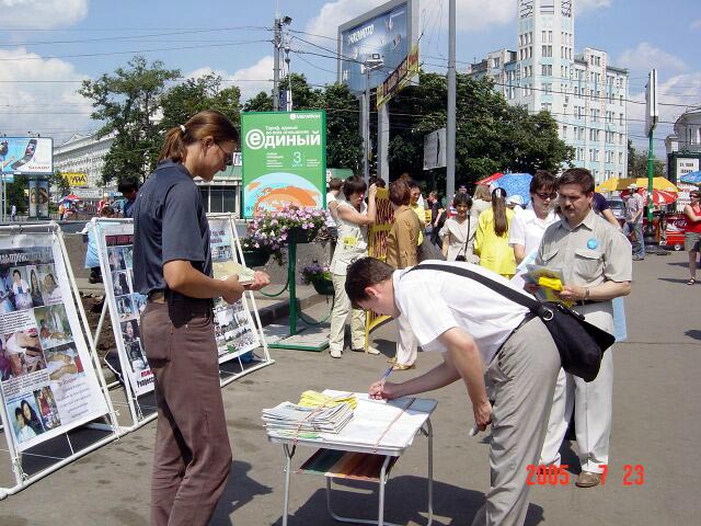 一位中国年轻人来到展板前,小弟子索尼娅马上送去真象资料,他愉快的接受了。学员向他讲真象,他说:“展板上说的这些事,我过去不知道,我听到和看到的都是(中国)国内报纸和电视上讲的。但我也想过,国内国外这么多人炼,一定不是个简单问题,这些材料我拿回去好好看看。”