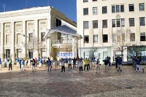 继集会游行之后,学员们分两路,一部份去中使馆前发正念,一部份去市中心古巴街做反酷刑展。