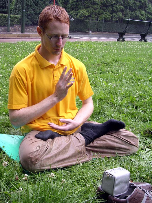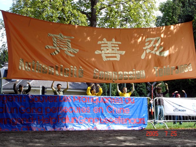 为抗议中共六年以来对法轮功的迫害,2005年7月25日,比利时部份法轮功学员到中国驻比大使馆门前举行和平抗议。