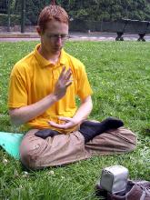 学员的和平抗议引来人们的好奇,他们从学员那里接过法轮功的真象传单,并仔细聆听学员讲解什么是法轮功,学员为什么要到这里来和平抗议。有一位老者走到横幅前专门等着学员给他传单。在听完学员的讲解后,他提到他一直对佛家的东西很感兴趣,很希望多了解法轮功,并指着阴云密布的天空祝学员好运。