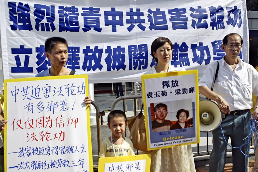 【明慧网2005年7月29日】新唐人电视台驻香港记者梁珍的母亲与哥哥,19日在四川省泸州市被公安强行拘留。7月27日,梁珍和支持她的社会人士,齐聚在中联办外,公开谴责中共漠视人权,要求中共当局立即无条件释放她的母亲和哥哥,并呼吁各方关注受迫害的法轮功学员。