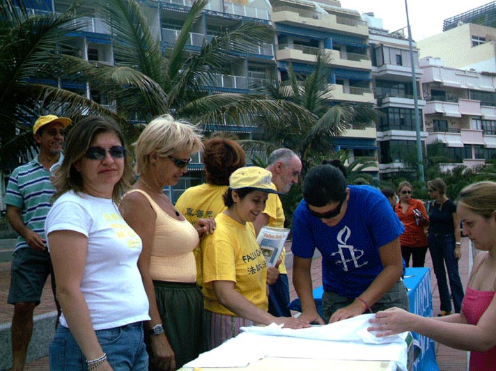 当地电台、电视台及西班牙第一大报《世界报》对法轮功学员進行了采访。《世界报》记者详细了解了法轮功的功法和发生在中国的迫害,最后留下了学员的联系电话,表示希望得到更多的资讯并且能够在以后進行连续采访。加纳利地方电视台在采访完一名国际大赦的工作人员后,特意将镜头对准了真、善、忍这三个字,并拍摄下来学员的黄色衬衫。