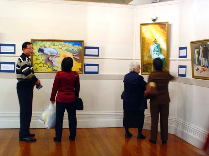 “真、善、忍”画展对揭露邪恶起到了巨大的作用,使邪恶之徒非常恐惧,他们给电讯大楼的负责人施加压力,要求学员拿下一些揭露酷刑的作品,说是有人不愿看这么残酷的东西。学员们都认识到这件事的严重性,开始加强发正念,并多次找负责人讲真象,同时向大楼里的工作人员及过往行人征集签名。许多人在得知真象后立即签名表示支持画展,有的甚至直接去找负责人,要求她不要那样做。在这个过程中,又有很多人了解了法轮功真象。虽然负责人还是以“上头的压力”为由,没有同意学员将取下的画从新挂到展板上,但也没有要求学员将画撤离展厅,默认学员将画靠在墙上,展现给人看。学员以此为切入口,对每一个来看画展的人讲述中共对法轮功的迫害是多么残酷,甚至延伸到了海外。