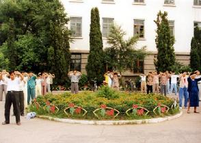1998年5月15日是师父传功讲法六周年,长春地质宫外圈法轮功学员炼功场景。那天正值原国家体委主任到长春视察。