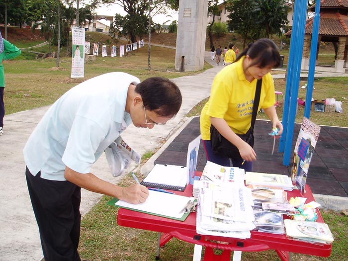 【明慧网2005年7月4日】近日来,马来西亚法轮功学员在几个不同的公园炼功点举行了反展活动,揭露中共对法轮功的残酷。2005年7月3日(星期日)早上,反酷刑展在八打灵(Petaling Jaya)的Taman Sri Aman公园的炼功点举办。虽然当天公园里晨运人士不是非常多,但是,经过活动地点的人士大部份都很乐意接受资料及聆听学员们讲述发生在中国的迫害真象,尤其当提到最近发生的中国法轮功学员高蓉蓉被残酷迫害致死的骇人听闻事件,人们都不禁为之动容,过后都以实际行动签名支持反迫害。
