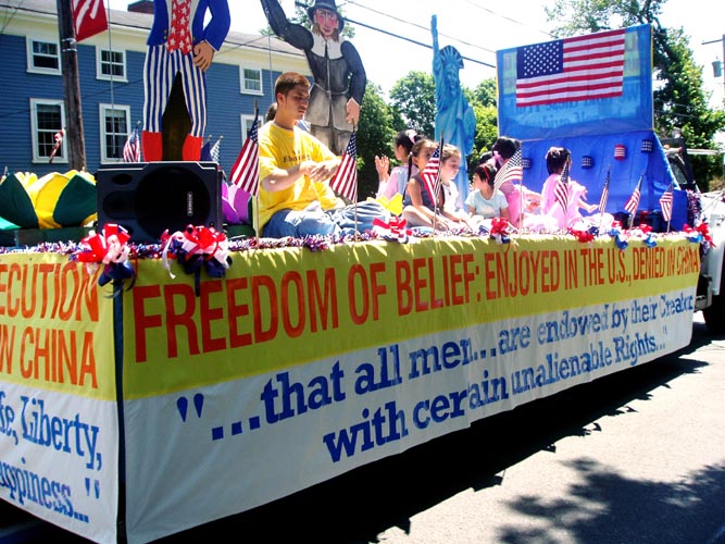 法轮功游行组织者爱尔先生说:“花车上的横幅向人们传递着这样的信息:‘造物主赋予人类不可侵犯的权利,那就是生命的权利和信仰自由的权利,这些都毋庸置疑。’‘我们在美国享有自由、民主,而中国却没有!’”