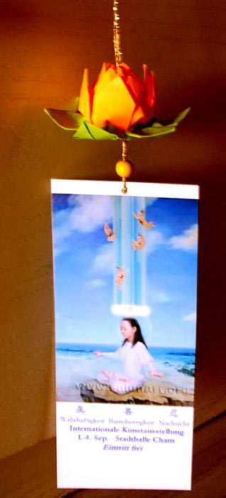 ![]() 拜恩州电视台“Quer”捕捉到手持请愿信的法轮功学员向总统夫人讲真象的镜头 | ![]() 法轮功学员赠给德国“第一夫人”的小莲花 |