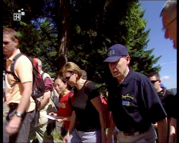 在上山顶的路上,学员走到了总统夫人的身边,自我介绍后,送上了一朵手工精心制作的小莲花。莲花下面挂有真善忍国际美展作品的书签,还注有该美展在卡姆地区即将展出的时间和地点。科勒夫人欣然接受了这份小礼物,并说她已经知道了法轮功学员在中国遭到迫害;随后,她听学员讲述了法轮功的近况。