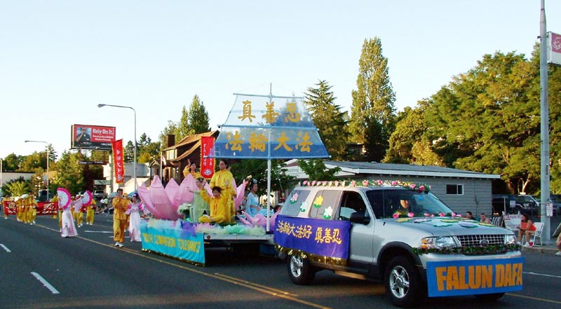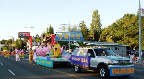 ![]() 花车上的功法演示展现了法轮大法的美好 | ![]() 法轮功的队伍赢得斯诺阔米市游行花车第一名 |
