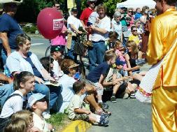 大法弟子的队伍一入游行街道,人们就开始鼓掌了。许多人向花车上的“仙女”招手,称赞“好美啊!”鼓队伴随着“法轮大法好”和“喜庆” 的音乐击打,每打完一曲,人们就热烈鼓掌。经过主席台时, 主持人向人们介绍了法轮功是中国古老的功法,基于“真善忍”的准则,至今已有78个国家的人民在炼法轮功。他说:大家看啊,那位在花车上的先生 (这位西人学员在炼抱轮), 整个游行他都是这个姿势,你能想象吗?很好!很好!