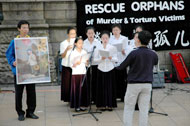 背景横幅十分醒目:“营救法轮功孤儿-在中国被迫害的法轮功学员的遗孤们”。演出场地旁边竖着的多幅展板讲述着这样的故事:放学回家,家门却被封,女孩无家可归(父母因修炼法轮功被警察抓走);父亲被迫害致死的女孩手擎爸爸的遗像说着:“我要爸爸”;和妈妈一起被关押的小男孩小手握着铁栏杆,满眼疑惑;流浪在街头的衣衫褴褛的赤脚小女孩……光是这些展板就足以动人心弦,观者无不面露同情之色。资料台上有对法轮功的介绍、揭露中共迫害法轮功的传单和光碟以及呼吁援助法轮功孤儿的征签表。音乐会还没开始,人们已经开始在征签表上签名了。