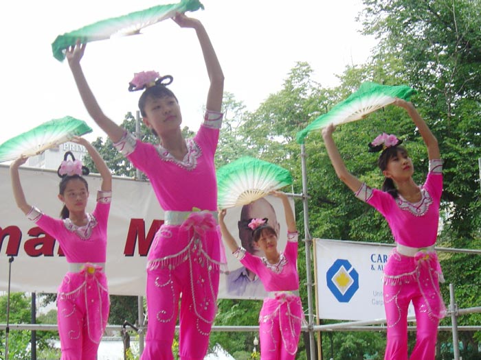 法轮大法学员在临时搭建的舞台上,为观众表演了中国传统舞蹈和古筝,并演示了五套功法。台下也有学员在发真象资料。表演受到现场观众的热烈欢迎,有几位观众上前要求与学员合影留念,卫生部长斯密特蒙也与表演舞蹈的学员合影。