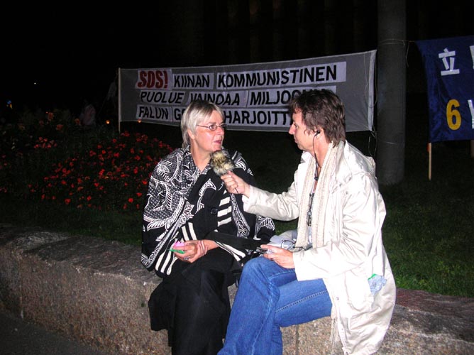 2005年8月12日,正值世界田径锦标赛在芬兰首都赫尔辛基(Helsinki)市举办期间,来自芬兰、拉脱维亚、瑞典及挪威的部分法轮功学员,在赫尔辛基市中心公园向来自世界各国的游客和媒体,以真人模拟演示酷刑的方式,揭露江和中共恶党对修炼真善忍的法轮功学员长达六年之久的残酷迫害,呼唤世人的良知善念,共同制止迫害。