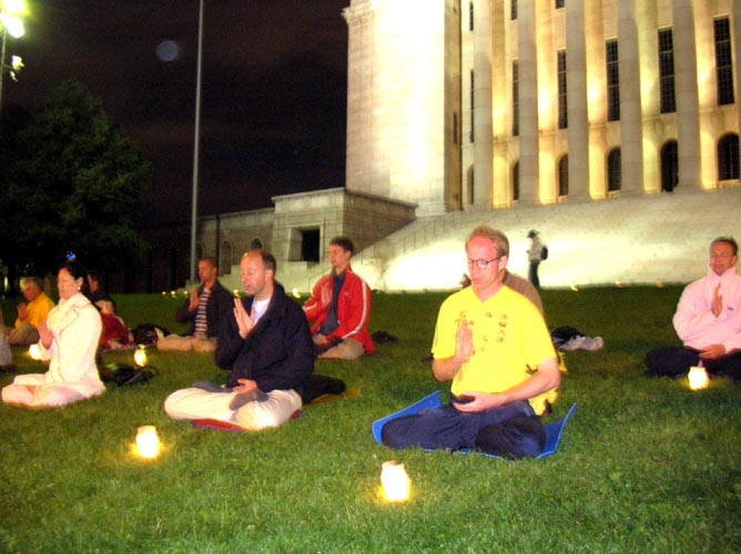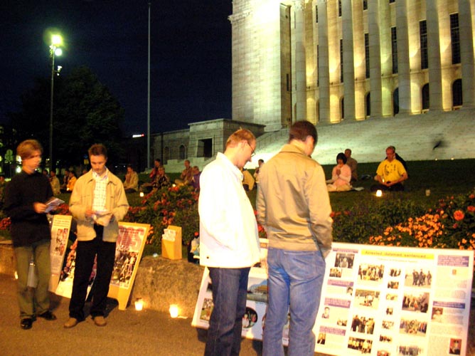 8月13日,世界田径锦标赛已近尾声。当夜幕降临,街上仍车水马龙之时,法轮功学员们在芬兰国会大厦前的人行道两侧挂起“法轮大法好”的横幅,摆放好揭露中共迫害法轮功的真象展板、部份被迫害致死的大陆同修的遗像,然后在大厦前的草坪上点起盏盏烛灯……