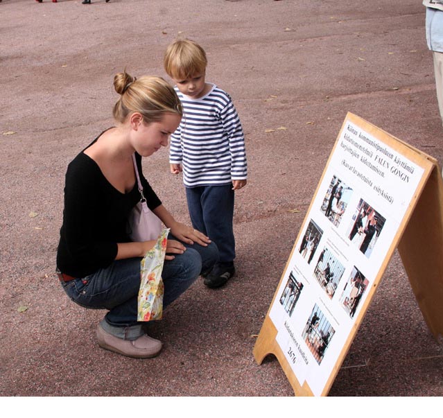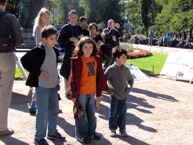 世锦赛期间赫尔辛基游人如织,热闹非凡,此公园内就设有五、六种表演。法轮功学员的展示场地位于公园中心,触目惊心的模拟酷刑演示和祥和的功法表演吸引了大批游客驻足观看。
