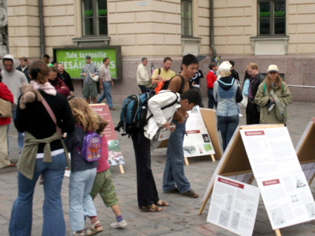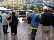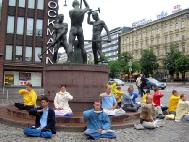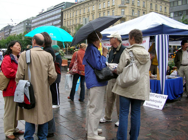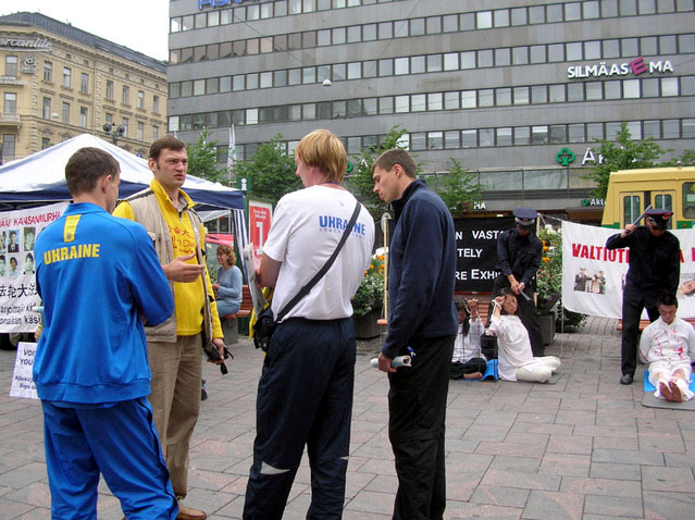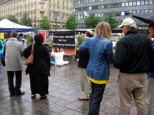 该日的赫尔辛基,阴雨连绵,在这里举办的2005年世界田径锦标赛已進入尾声。然而,在反酷刑展周围,一批批的人在围观。他们中有芬兰人,也有来自各国参加世锦赛的代表团成员和游客。从他们惊奇的表情,愤怒的眼光、同情的泪水和果断的签名中,可见他们的内心在产生着震动。一端是祥和的功法表演,一端是残暴的酷刑展示,两者形成鲜明的对比。