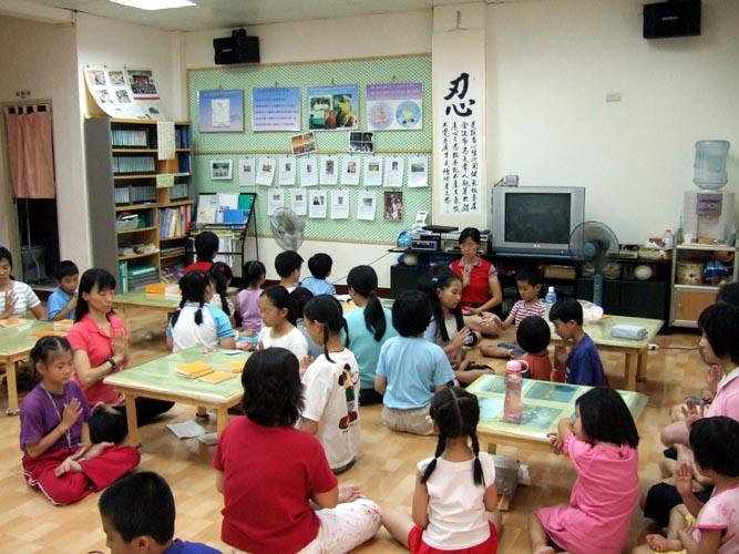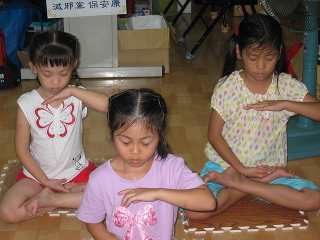 活动的下半段是炼功及打腰鼓,今天炼的是打坐。小玉今年要读四年级了,她和小朋友分享曾经在学法组交流中听阿姨说,如果没有精进炼功学法的话,所对应的天体世界将是荒芜一片、死气沉沉。再加上刚要上幼稚园中班的弟弟祥祥可以盘腿一个小时。因此,小玉说什么也要做完一个小时,有时还一把眼泪一把鼻涕的坚持。小朋友听完后,除比学比修外,也受到鼓舞,相信日后在打坐盘腿时,会更加严格要求自己。