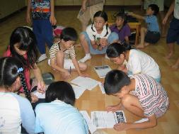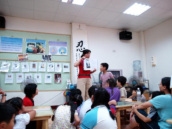 在大家一起学完《洪吟(二)》后,阿姨同修拿着“国际真善忍画展”的画册和小朋友分享几幅画,其中有一幅名称叫做“金刚不动”,图画中有一位法轮功学员在打坐,恶警拿刑具威胁她,她仍一如金刚的动也不动,画的上方有小天使抓住恶警刑具的图样,在交流中有小朋友说,图画中打坐的阿姨金刚般的正念可以制止恶警行凶,更可以让另外空间的佛道神受到感动来帮她。交流中,阿姨同修还提醒小朋友发正念专注的重要。