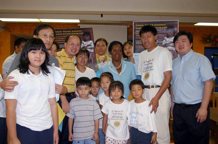 “营救孤儿”小组的小成员,被介绍给国会议员,当议员知道“营救孤儿”汽车小组的小成员不顾长途跋涉,来到休士顿时,高兴的与这群小朋友以及法轮功学员合影留念,当地电视台抢拍了这个镜头。