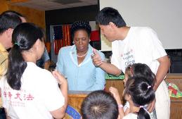 当德州“营救孤儿”汽车之旅于8月20日(星期六)从奥斯汀来到休士顿的时候,正逢美国国会议员希腊杰生•李(Congresswoman Sheila Jackson Lee)出席当天下午有关“移民法”的民众会议。“营救孤儿”小组与当地一部份学员也参加了这个会议。当议员希腊杰生•李与相关人员发言结束后,有机会让一些民众提出问题。法轮功学员黄先生,向议员讲述了中共迫害法轮功的情况。