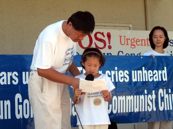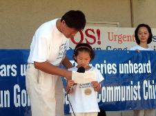 一行十人的团队,每个人都身着写有“营救被迫害的法轮功儿童”字样的白色T恤衫,其中四人是大法小弟子,他们与父母一起在这短短的两天时间里,不辞辛苦的奔波,希望通过大家的努力,能使中国大陆那些与他们年纪相仿的孩子也能象他们一样拥有一个快乐的童年。在新闻发布会上,有两位小弟子发言说:“请大家支持营救在中国的法轮功孤儿。”