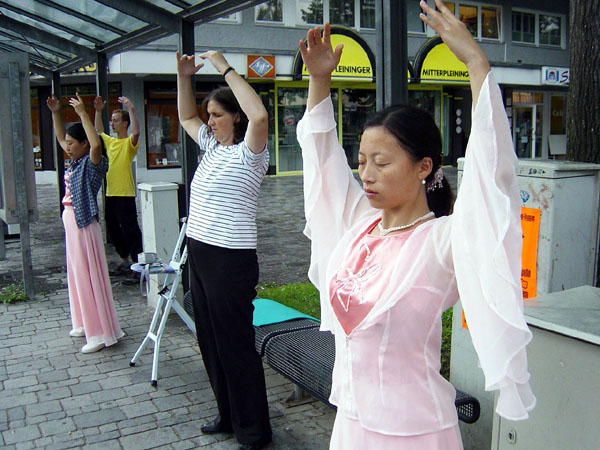 ![]() 法轮功学员的展台 | ![]() 炼功 | ![]() 舞台上的功法表演 |