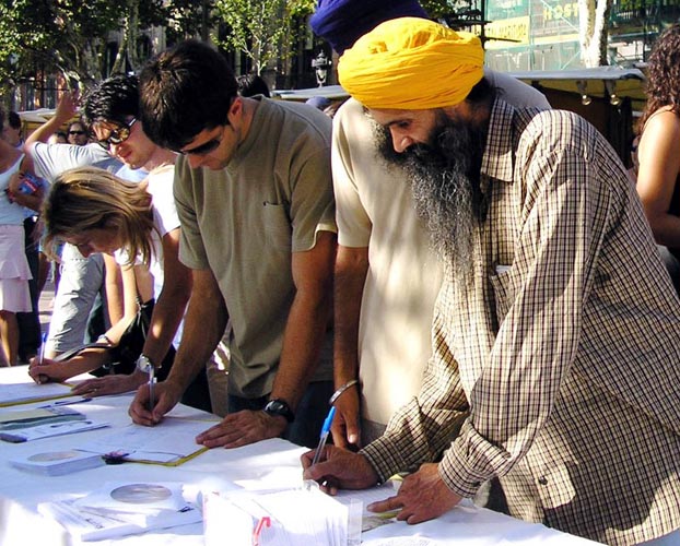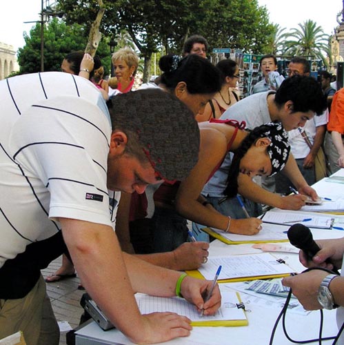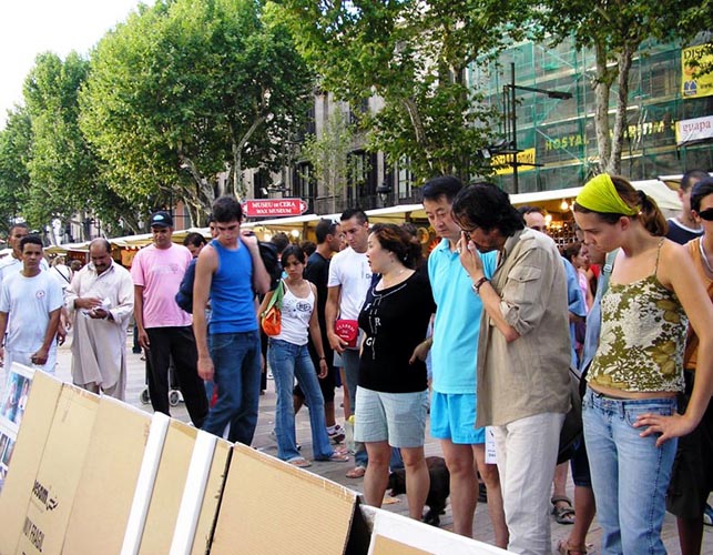 兰布拉斯大道惯有的人山人海,车水马龙的人流停下来了!在揭露残酷迫害的图片前,过路的行人被震惊了,他们不敢相信自己的眼睛,有些人甚至落下了眼泪,人们无法相信就在此时此刻在中国正在发生着如此血腥、残酷的群体灭绝,人们更无法想象一个政权会对自己的人民如此残暴。当人们了解到声援签名可以帮助尽快结束这场迫害时,他们毫不犹豫的聚集到签字桌前郑重的写下他们的名字。