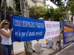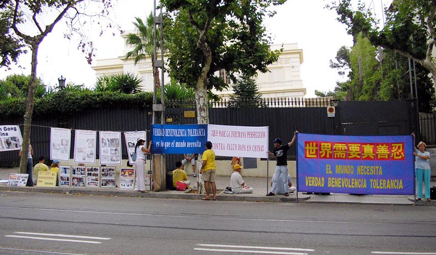 8月15日,西班牙法轮功学员们来到了中国驻巴塞罗纳领事馆,和平抗议中共对法轮功持续六年多的残酷迫害。在这里,巴塞罗那的学员们已经坚持2年在中领馆工作日的时间向来此办理手续的中国人讲述法轮大法以及正在中国发生的迫害真象。通过这两年的不懈努力,中国人对法轮功的态度已经发生了很大的改变,从最开始不愿、不敢接受真象传单,有的甚至破口大骂,直到现在,很多人主动向学员们索要传单并表示感谢。虽然西人学员们不会讲中文,但他们打印出来的中文劝善信、他们播放的中文真象录音以及他们坚忍的信念和纯净的心深深的打动中国人的心,以前中共散播的恶毒谎言正在人们的心中消溶,换来的是对法轮大法以及大法弟子们的正确认识和敬重。