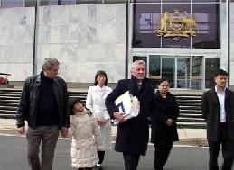 【明慧网2005年8月3日】澳洲法轮功学员起诉外交部长唐纳签发禁止法轮功学员在中国大使馆前打横幅的特别行政令一案,于2005年8月1日上午在堪培拉最高法院举行第二次“法庭对执” (“Direction Hearing”)。此案的申诉人章翠英、戴志珍、将为此案作证的自由法学家袁红冰教授和已公开宣布退出中共的前610办公室官员郝凤军先生,以及来自澳洲各地区的法轮功学员8月1日到场声援,并于“法庭对执”后举行了新闻发布会。