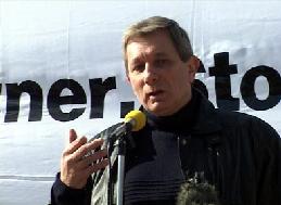法轮功代表律师Bernnard Clollaery在集会上发言