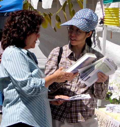一位女士说她听说过法轮功,她在旧金山中领馆前见到学员在那里请愿,但她不明白为什么中共要迫害法轮功。学员告诉她,中国有上亿的人炼法轮功,当时的中共头目江××出于妒忌镇压法轮功,已经有将近3000名法轮功学员被迫害致死。她听后表示,希望法轮功能够最终获胜。