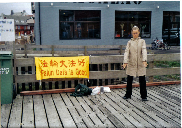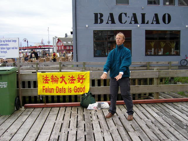 在罗福登群岛的主要城镇斯沃尔夫(Svolv),学员们竖起横幅并演示法轮功功法,一位学员炼功,另一位学员则发真象小册子。许多旅客接到以他们自己语言印制的小册子时,都非常高兴,学员们遇见的人有来自英国、德国、日本、法国、以色列和其它国家的人。