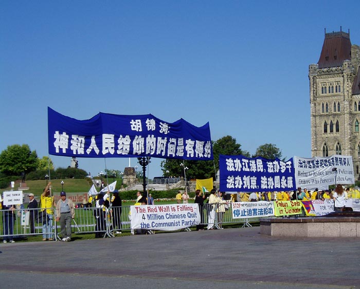 9日上午,加拿大魁党亚太事务发言人、国会议员罗杰-克莱文(Roger Clavet)出现在国会山大草坪法轮功学员请愿现场,克莱文同法轮功学员合影,并说,“我一会儿会见到胡锦涛,会同他提法轮功问题。”议员大卫-乔高(David Kilgour)也赶到国会山支持请愿的法轮功学员。