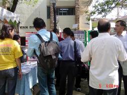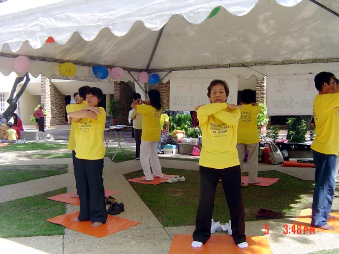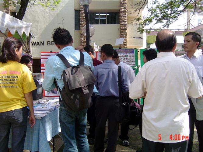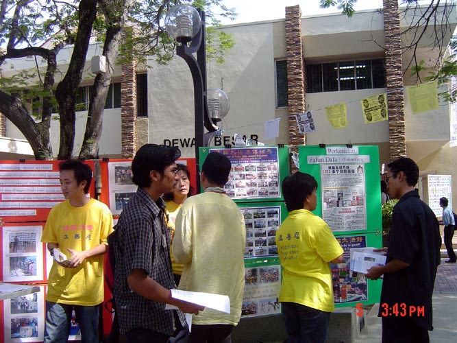 于是,我们学员安排了在9月5日、6日以及9日的下午3点至5点在该大学校园里洪法炼功、讲真象及征签活动。虽然当时正值上班时间,但是有多位学员都积极参与配合,大家在这难得的机会里,跟这所工艺大学的学生讲真象,让他们了解大法的真象,有的学生在当场就学炼功,而大多数了解真象的学生都在“呼吁停止迫害”的征签簿上,签名表示支持。
