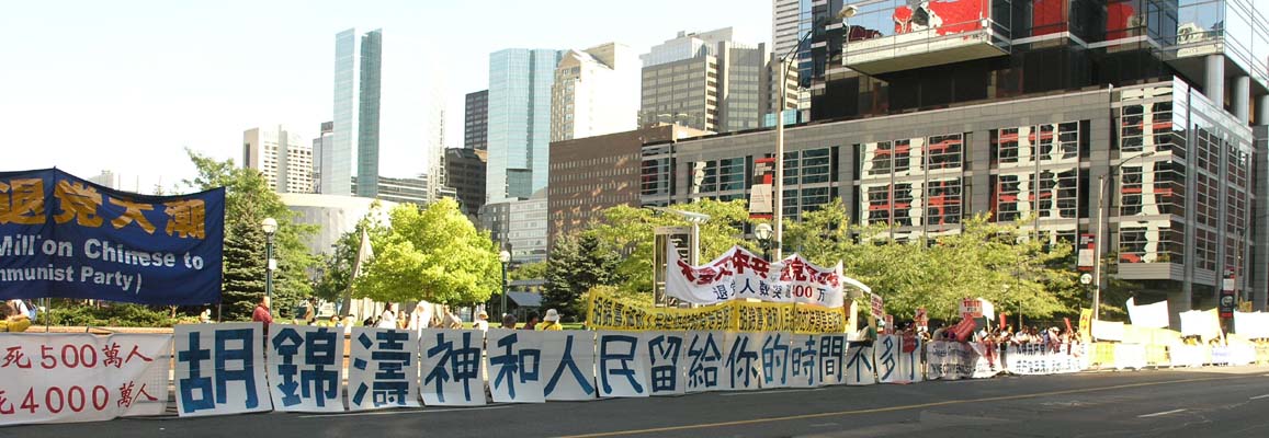 胡锦涛一行于9月10上午11点20分左右从其下榻的多伦多洲际酒店后面的小道进入酒店的停车场。使得从早上7点多就开始在酒店正门敲锣打鼓扭秧歌的多伦多华人“欢迎”队伍没能有机会见到他们要见的人。