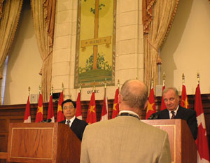 中共迫害法轮功问题成为近日加拿大主流媒体报道的焦点。9月9日上午11点20分,加拿大电视台资深记者罗杰-史密斯在国际众多媒体面前,询问胡锦涛对国会山外展示受到迫害和酷刑折磨的法轮功学员、民运人士和知识份子的诉求有何回应。胡锦涛回避了此问题。