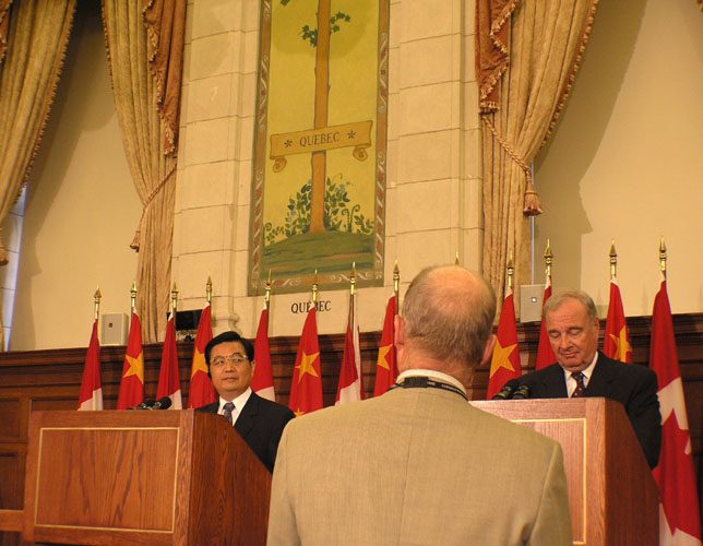 ![]() 图:9月9日上午11点20分,加拿大电视台资深记者罗杰史密斯在国际众多媒体面前,询问胡锦涛对国会山外展示受到迫害和酷刑折磨的法轮功学员、民运人士和知识份子的诉求有何回应。 |