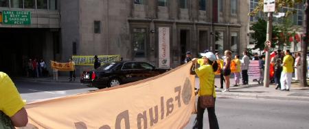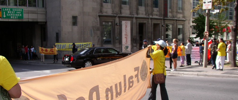![]() 图:胡锦涛的车队从多伦多洲际酒店后面的小路进入酒店时,被法轮功学员迎到。 |