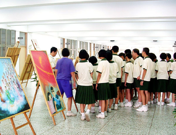 当学生看到迫害的画作时,都觉得血腥、暴力,不忍正视,经过导览人员的解说后,学生们说:“共产党是凶神恶煞!”