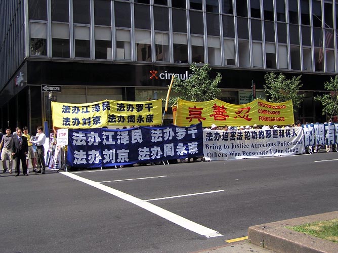 “胡锦涛,神和人民给你的时间是有限的”蓝底白字大横幅在和16个硕大的纸板刻字“胡锦涛,神和人民给你的时间是有限的”交相辉映,要传递的信息明确、清晰,隔街都看的清清楚楚。