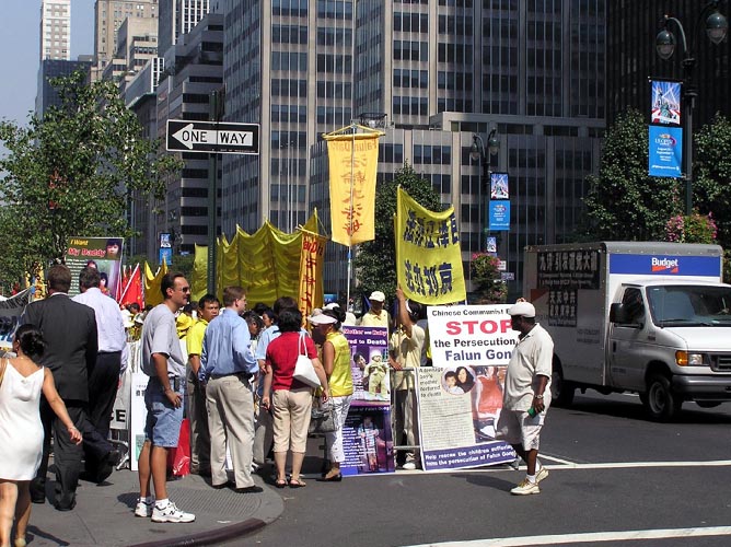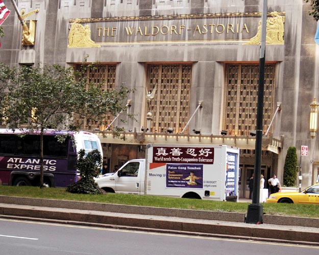 沃道夫酒店位于曼哈顿中城,人流不断,许多有缘人看到了法轮功学员的横幅,接拿资料,并认真阅读。一位学员在路口发“今日法轮功”,一位穿着非常体面的中年男士接过资料,并询问到底是什么。学员告诉他是打坐修炼,在中国千万人受迫害,只因为他们想坚持这个修炼方式。中年男士问他能帮什么忙呢?学员告诉他告诉更多的人,呼吁停止这场迫害, 因为中共希望通过做生意使美国人不发出正义的声音。这个中年男士听明白了,又自己拿了一份报纸,并说他会这样去做的。