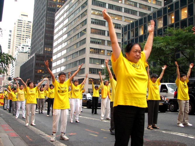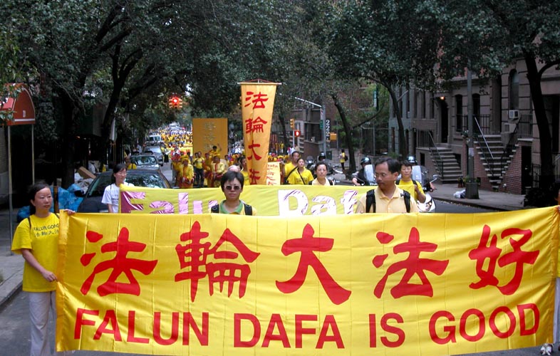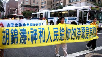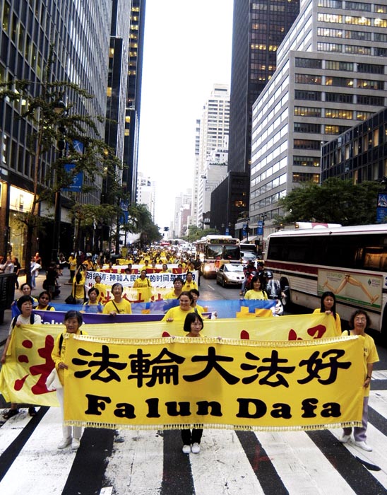 傍晚约6点,正值下班高峰时间,曼哈顿中城的行人和车流熙熙攘攘,好不热闹。法轮功学员的游行队伍,由开着摩托车的警察开道和卫护,从35街、1大道出发,经由3大道,再折转47街,最后到达联合国大楼旁。队伍延绵十几个街区,气势磅礴,绵绵长长,首不见尾。下班族们惊讶于这浩荡的队伍,许多人仔细阅读着横幅的内容,有的人匆忙取出手机拍下这历史镜头,有的人鼓掌,还报以会心支持的微笑。