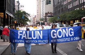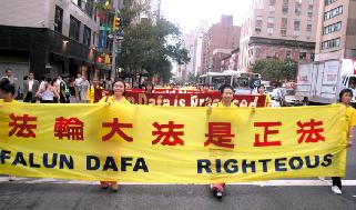 ![]() 队伍以一写着英文“法轮功”的金黄横匾为前导 | ![]() 告诉世人“法轮大法好” |