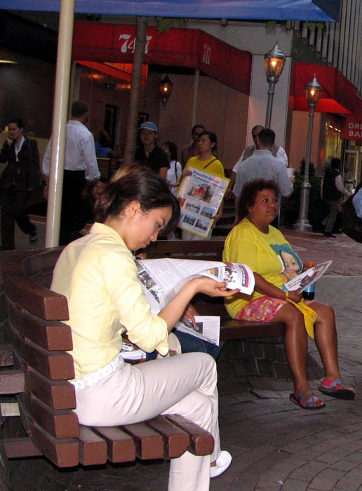 ![]() 见到游行队伍,路人匆忙取出手机拍下这历史的镜头 | ![]() 迫不及待的阅读大法真象资料 |
